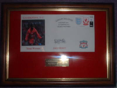EMILE HESKEY TREBLE FRAMED SIZE 12"x10" RED FELT GOLD PLAQUE ENGRAVED 'LIVERPOOL FC 2001 TREBLE WINNERS'