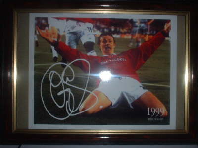 'WHO PUT THE BALL IN THE GERMANS NET.......OLE GUNNAR SOLSKJAER' PRINT OF THE FAMOUS NIGHT OF CELEBRATIONS FRAMED IN GOLD EDGED 12x10! TREBLE WINNERS 1999!