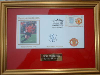 OLE GUNNAR SOLSKJAER AUTOPEN TREBLE 1999 COVER FRAMED IN GOLD COLOURED FRAME SIZE 12"X10" AND RED FELT BACKING! ENGRAVED GOLD PLAQUE!'TREBLE WINNERS 1999 MANCHESTER UNITED'