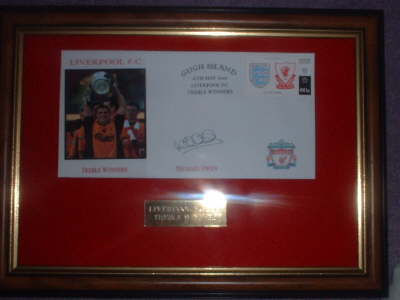 MICHAEL OWEN TREBLE FRAMED SIZE 12"x10" RED FELT GOLD PLAQUE ENGRAVED 'LIVERPOOL FC 2001 TREBLE WINNERS'